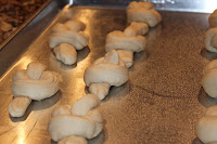 I take a tennis ball sized amount of dough and roll it in my hand to make a snake or 6 inch rope. Then I just take the rope and tie it in a knot. Spray your hands with cooking spray to keep the dough from sticking. Spray as often as you need too.I place them on a large cookie sheet and let them rise for 20 minutes and then bake them for 20 minutes.